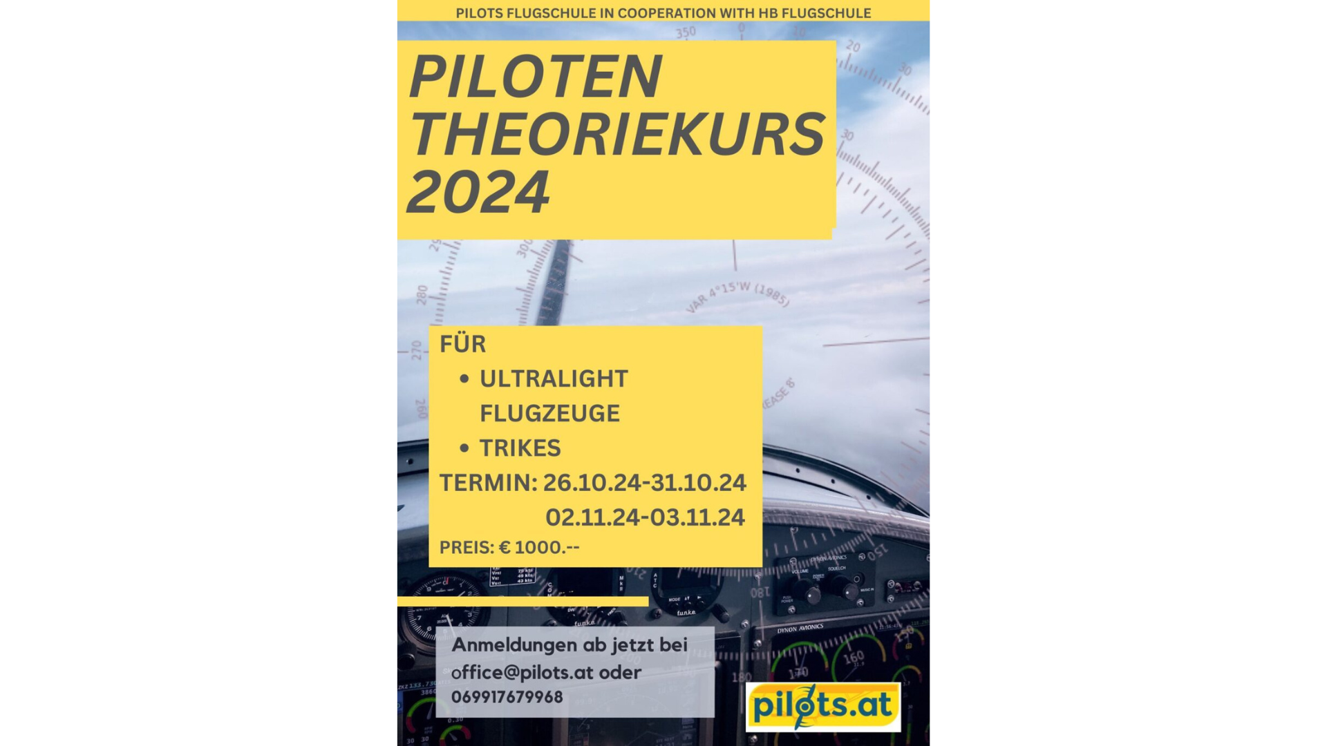 Als einen der ersten Events oder Kurse können wir euch den Piloten Intensiv Theoriekurs unseres Partnervereins Pilots Flugschule empfehlen. Dieser Kurs ist die Basis für die Ausbildung mit Ultralightflächenflugzeugen und Trikes und wird selten so kompakt angeboten. Das heisst für schnell Entschlossene besteht die Möglichkeit in einer Woche den Theoriekurs zu erledigen, welcher in anderen Vereinen zum Teil mit 2×3 Abendstunden / Woche angeboten wird und dadurch viel länger dauert.